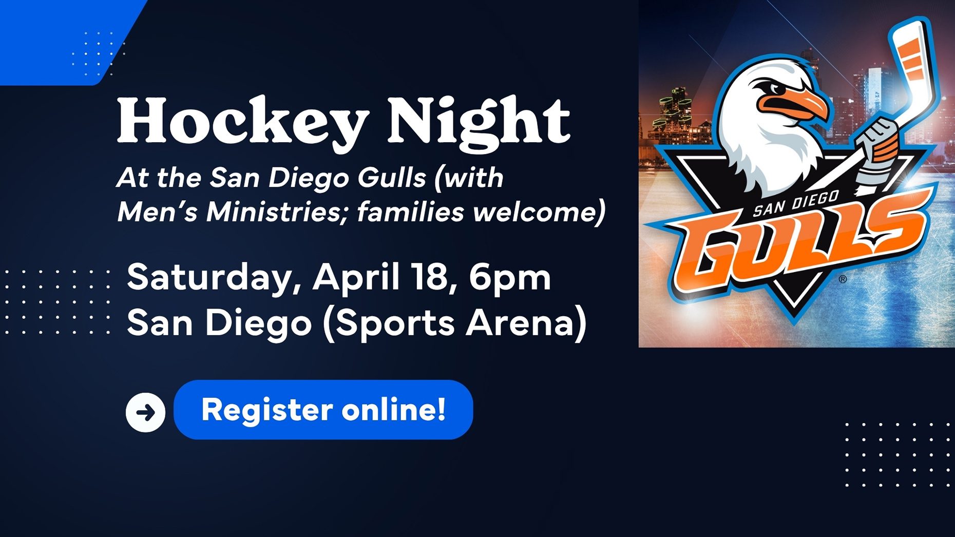Come and join us for Hockey Night with the San Diego Gulls, sponsored by Men's Ministry, on Saturday, April 18. |